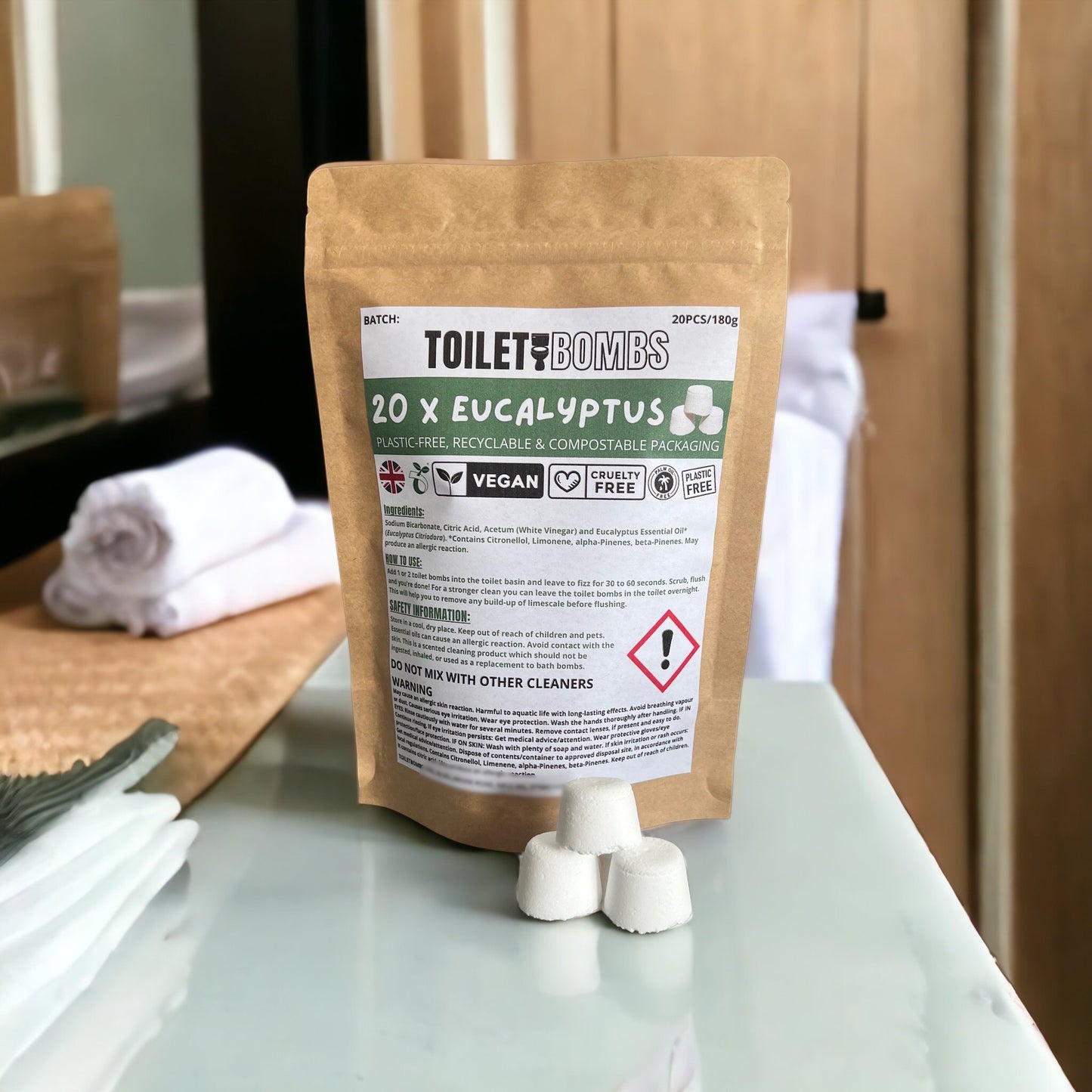 Eucalyptus Toilet Bombs: Sodium Bicarbonate, Citric Acid, Acetum (White Vinegar) and Eucalyptus Essential Oil* (Eucalyptus Citriodora). *Contains Citronellol, Limonene, alpha-Pinenes, beta-Pinenes. May produce an allergic reaction.